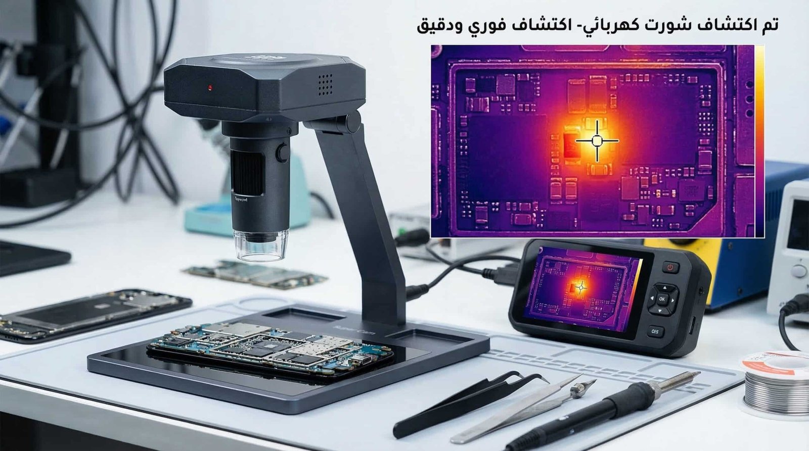 مع تطور معمارية الهواتف، وتقلص حجم المكثفات والمقاومات، وظهور مسارات تحت آيسيهات الـ BGA محمية بـ “شيلد” معدني، أصبح الاعتماد على الطرق اليدوية مضيعة للوقت ومخاطرة بسلامة اللوحة الأم. هنا دخلت الكاميرا الحرارية (Thermal Camera) كأداة تشخيص ثورية غيّرت قواعد اللعبة بالكامل في ورش الصيانة، محولةً عملية التشخيص من التخمين العشوائي إلى الرؤية العلمية الدقيقة.