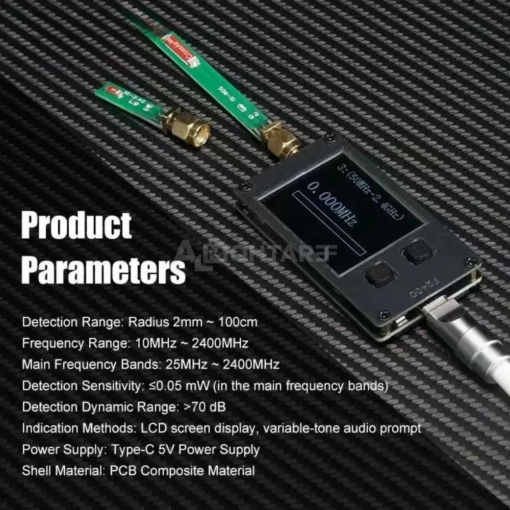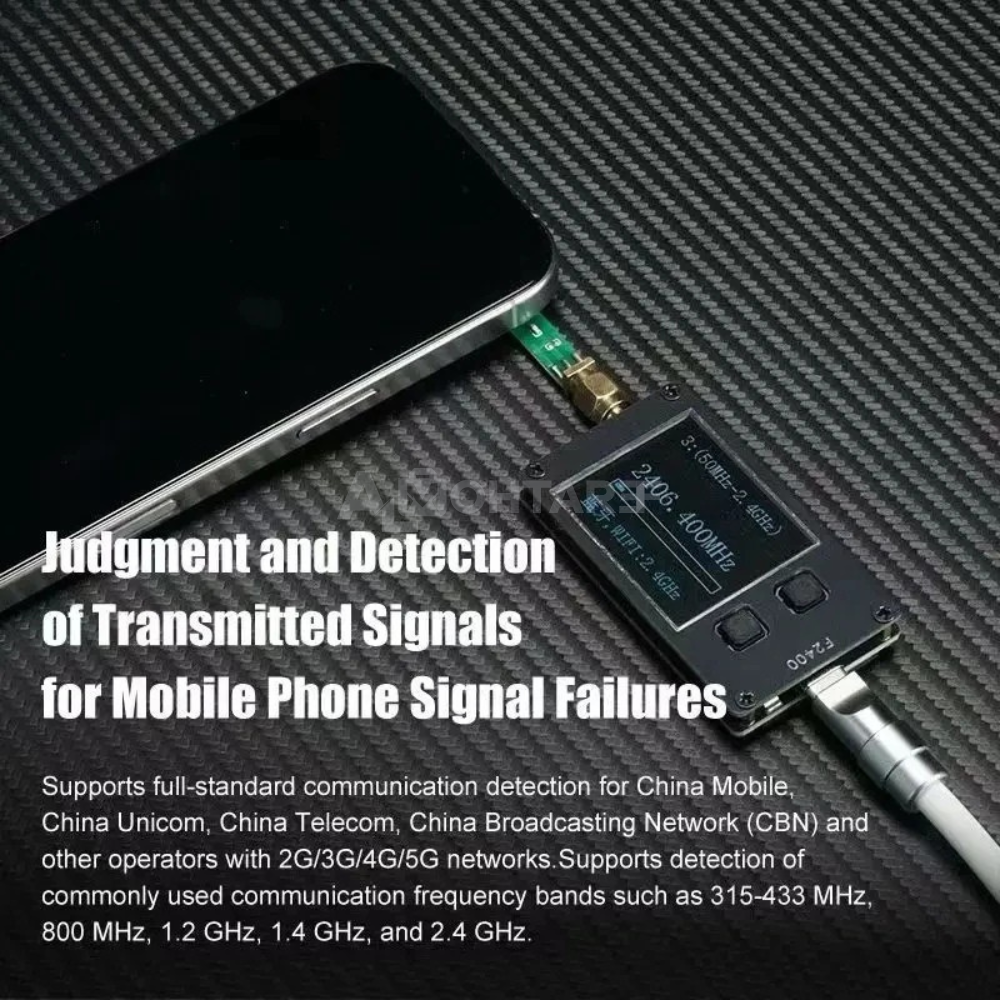 جهاز فحص ترددات لاسلكي (Frequency Counter) موجه لفنيي الجوال. يستخدم للتأكد من سلامة دائرة الإرسال (TX) وفحص آيسي الشبكة (PA) عند إجراء المكالمات. يكشف إشارات الشبكة، الواي فاي، والبلوتوث. (يدعم أيضاً فحص ريموت السيارات).