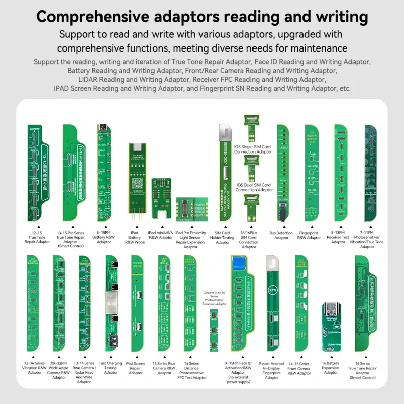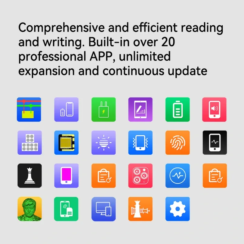 الجهاز الشامل لبرمجة وصيانة الآيفون. يستخدم لاستعادة الترو تون (True Tone)، تعديل صحة البطارية، وإصلاح بصمة الوجه (Face ID). يدعم الموديلات من iPhone 6 وحتى iPhone 16 Pro Max. يدعم التحديث عبر الواي فاي.