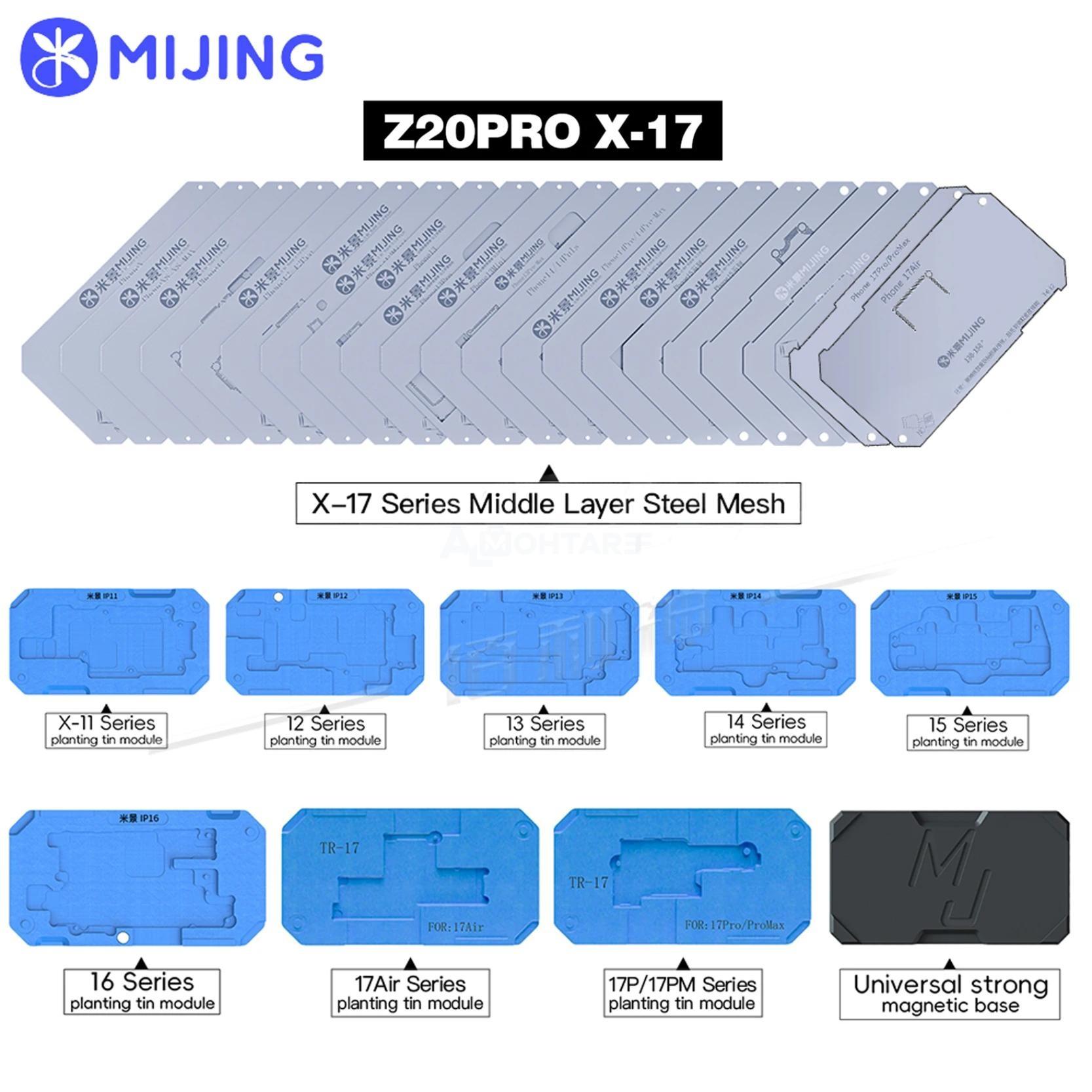 قاعدة الشبلنة واللحام المغناطيسية الاحترافية Z20 Pro من شركة MiJing. توفر حلاً متكاملاً للتعامل مع اللوحات الأم المزدوجة (Middle Layer BGA) لعائلة الآيفون بالكامل بدءاً من (iPhone X) وصولاً إلى أحدث الإصدارات (iPhone 17 Pro Max). تتميز بتموضع مغناطيسي فائق القوة، وشبلونات دقيقة تمنع انتفاخ القصدير، ومواد مقاومة للحرارة العالية لضمان تطابق البوردتين بنسبة 100%.