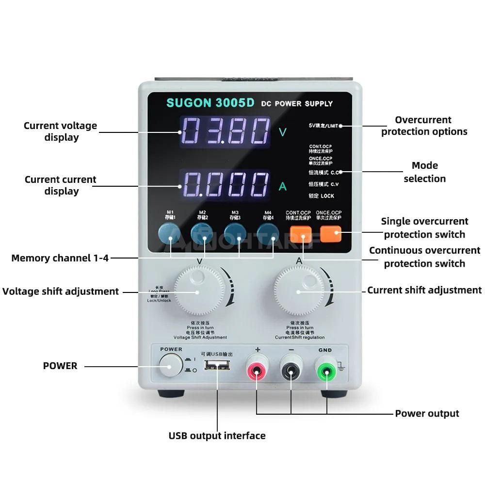 – دقة الإعداد: <0.05% +20 mVAdjustable power supply providing up to 30V and 5A. Suitable for maintenance and repair.