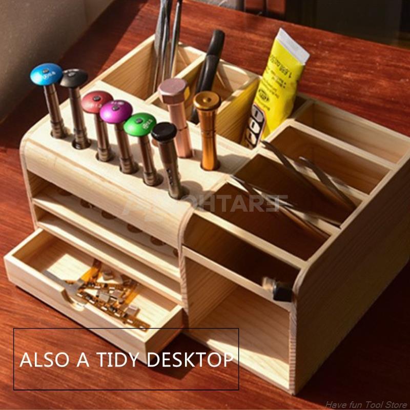 صندوق خشبي متعدد الوظائف مثالي لتنظيم الأدوات والأجزاء الصغيرة. يتميز بتصميم ذكي يسمح بتخزين المفكات والملاقط والبراغي واللوحات الأم الصغيرة. مصنوع من خشب طبيعي وغير سام، مما يجعله آمنًا وصديقًا للبيئة. يوفر مظهرًا احترافيًا للطاولة ويقلل من فرص ضياع الأدوات.