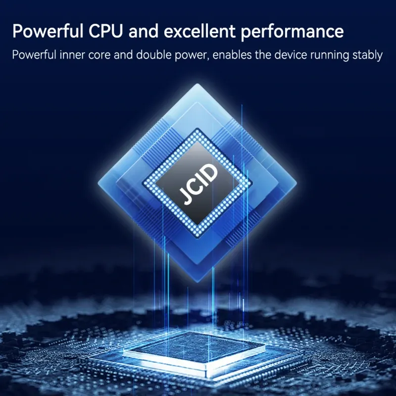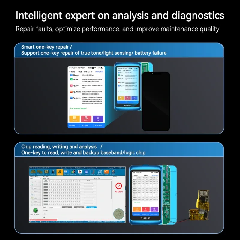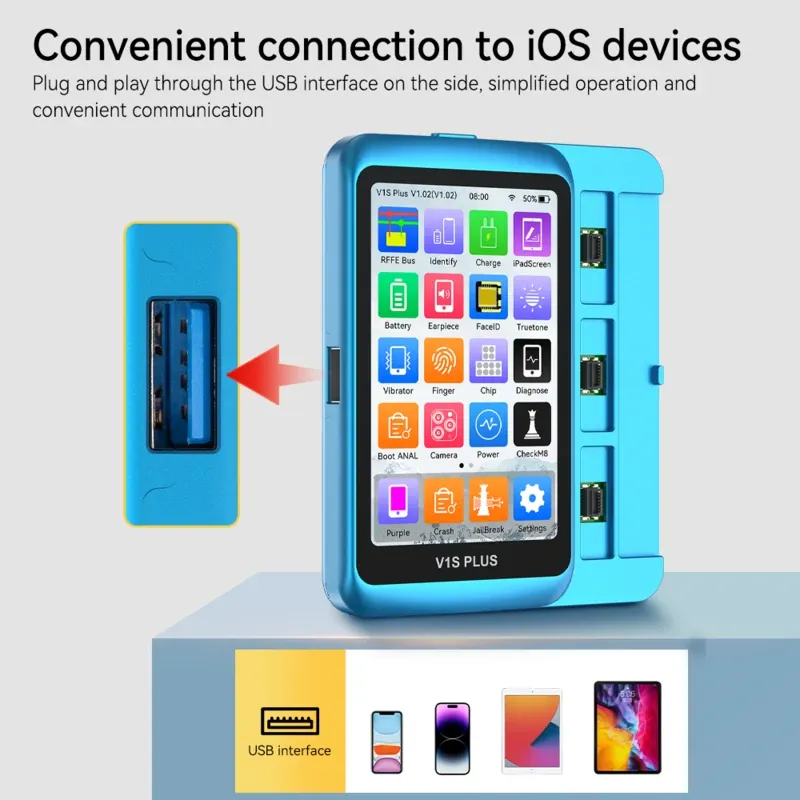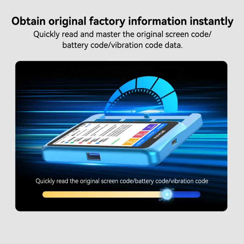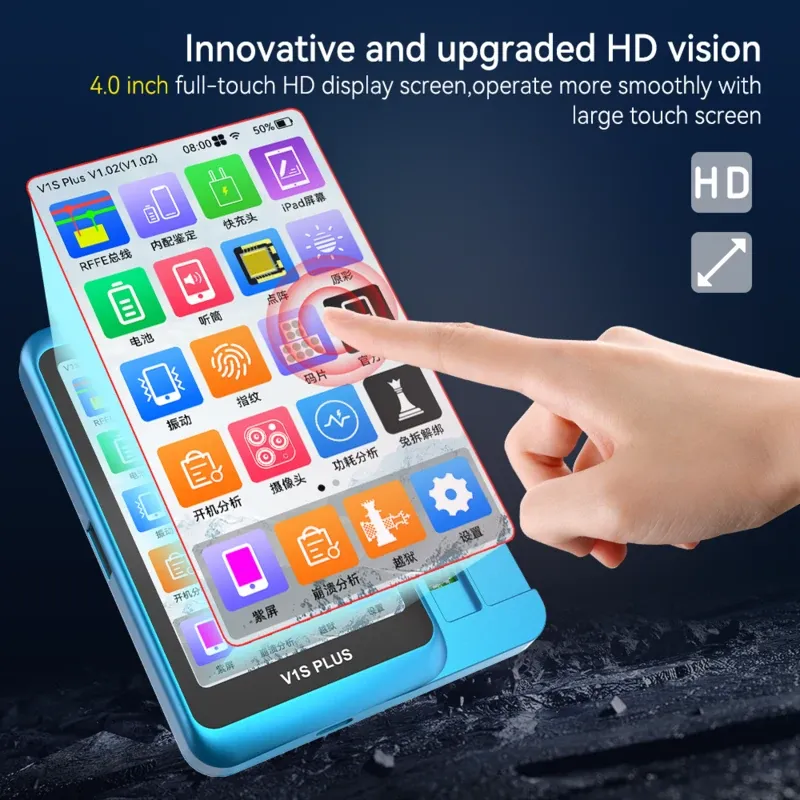 The JCID V1S Plus programmer allows data transfer from damaged to new components to avoid error messages such as non-original screen or unknown battery. It features a powerful processor, large display, and Wi-Fi connectivity for updates, including an interchangeable board system.