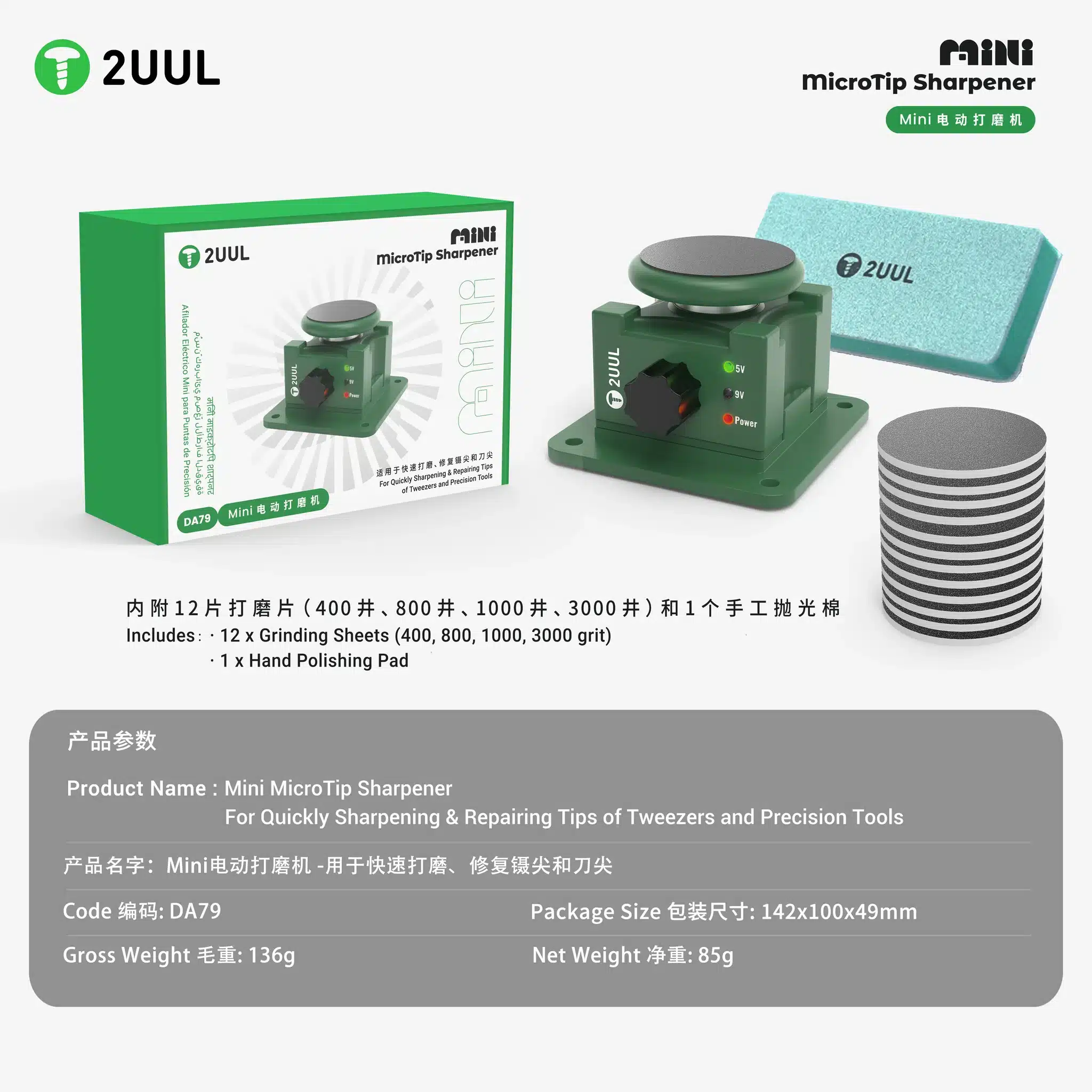 The 2UUL DA79 Mini MicroTip Sharpener is a versatile restoration tool engineered for professional technicians. It serves a dual purpose: reviving oxidized soldering iron tips and realigning precision tweezers, extending the lifecycle of your essential workbench tools.